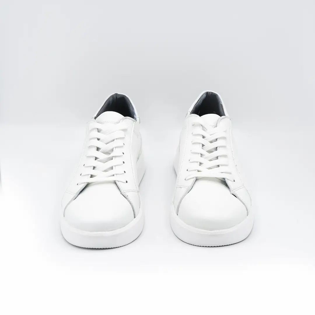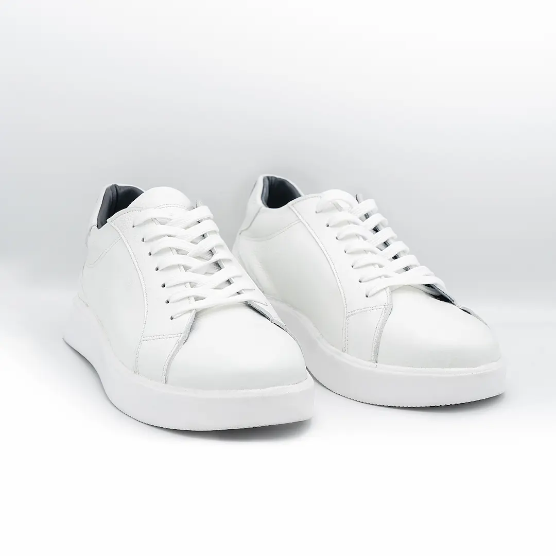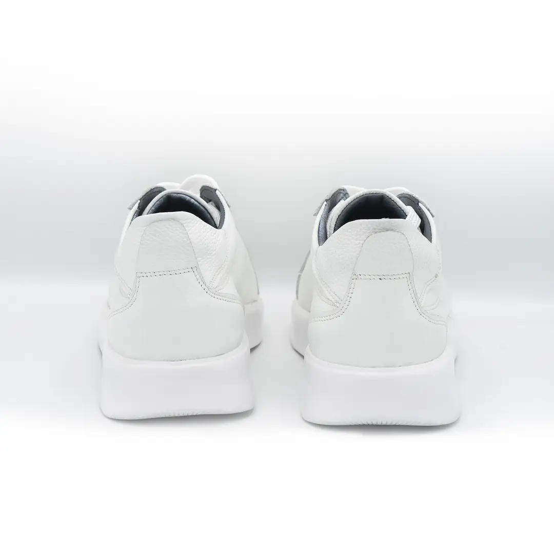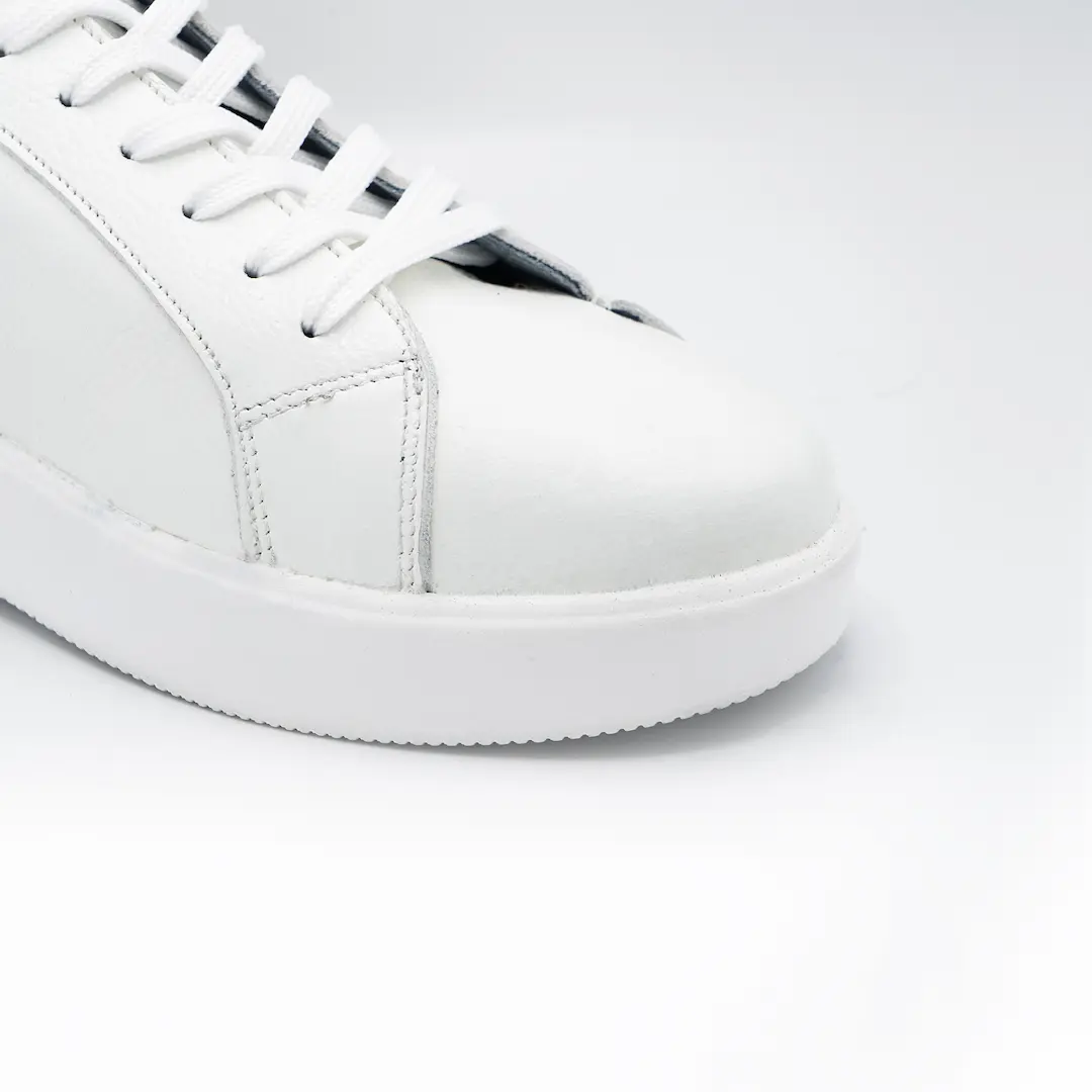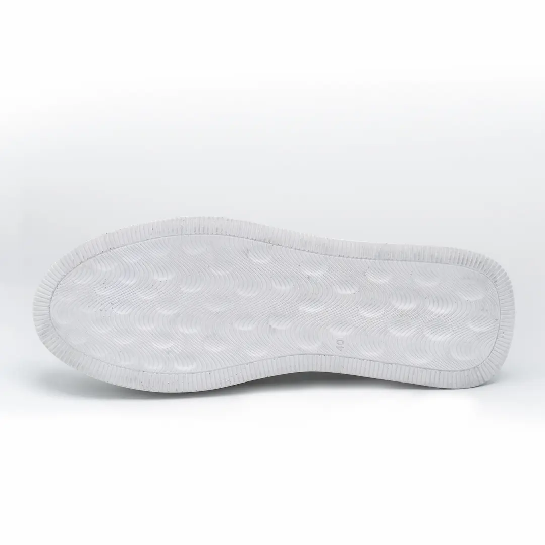 بدنهی اصلی این کفش از چرم مصنوعی مرغوب (پو) با پوشش رنگی سفید یکدست و پرجلوه ساخته شده است. این متریال انتخاب شده تا علاوه بر ارائه ظاهری نرم و یکدست، در برابر خط و خش روزمره مقاومت بهتری نسبت به چرم طبیعی رنگشده داشته باشد. سطح آن به راحتی تمیز میشود و درخشش اولیه خود را با مراقبت ساده حفظ میکند.